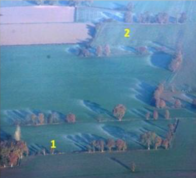 Nous observons sur la photographie aérienne (Figure 1) l’ombre des arbres qui a ralenti la disparition de la gelée blanche sur la végétation herbacée. La parcelle 1 est de forme rectangulaire et l’ombre de certains arbres la traverse intégralement. Les haies parallèles sont proches (grain fin). La parcelle 2 est carrée et le centre est dégagé, la distance entre les haies est plus importante (grain grossier), observable Figure 2.