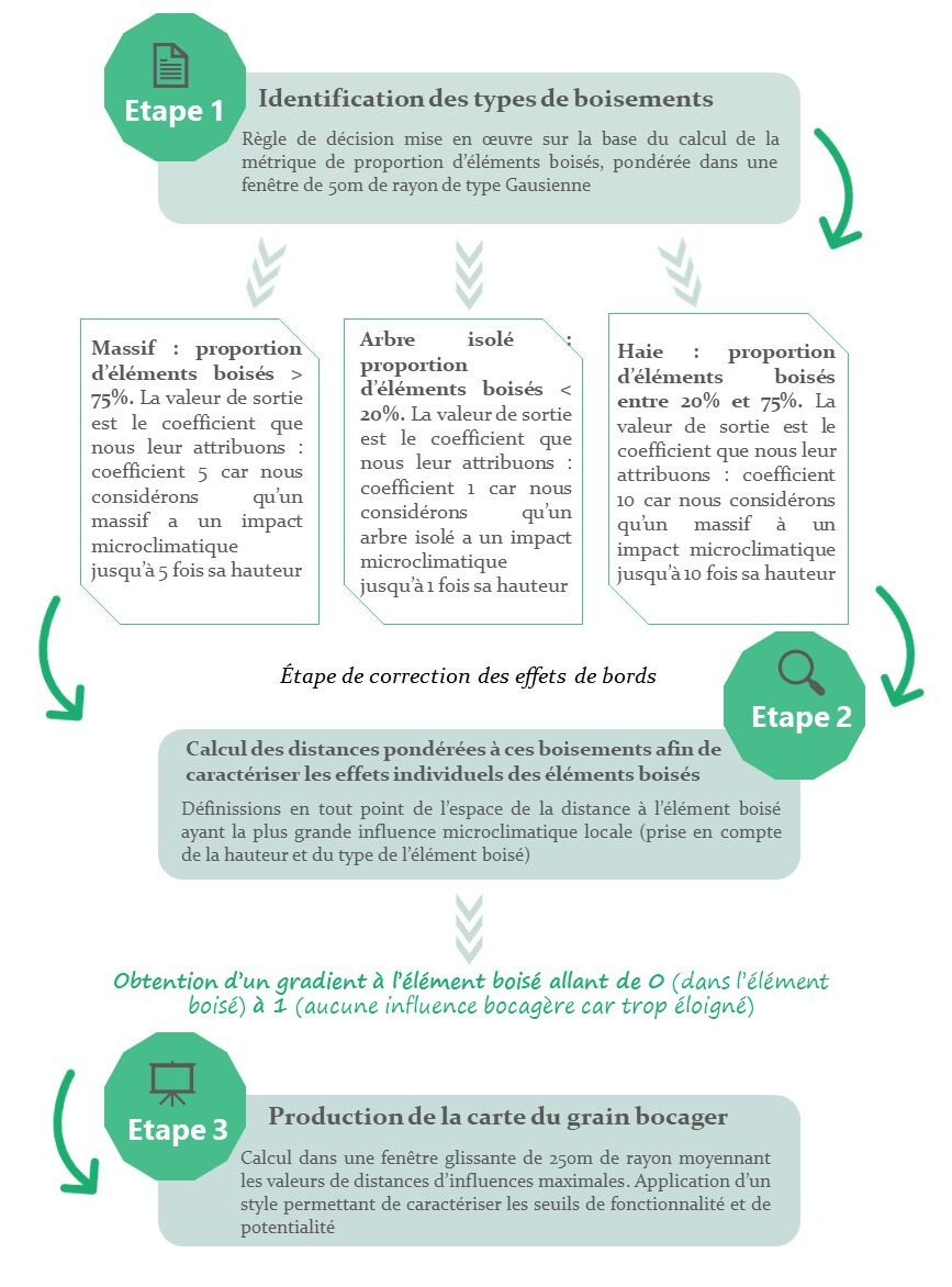 La génération de la carte du grain bocager comporte trois étapes (Figure 3). En entrée, il faut intégrer des données de hauteur de canopée. La première étape consiste à identifier les types de boisements (massifs, arbres isolés, haies) car ils ne disposent pas du même effet micro climatique sur la biodiversité. La seconde étape consiste à caractériser les distances d’influence des boisements, ce qui modélise l’effet individuel des éléments boisés. Enfin, la dernière étape consiste à calculer la métrique du grain bocager en moyennant ses effets individuels pour caractériser l’effet cumulatif du bocage. L’information obtenue peut ensuite être classifiée selon des seuils de fonctionnalité, afin d’observer des zones à enjeux particulières.